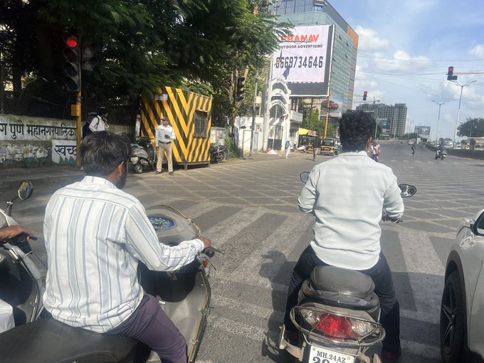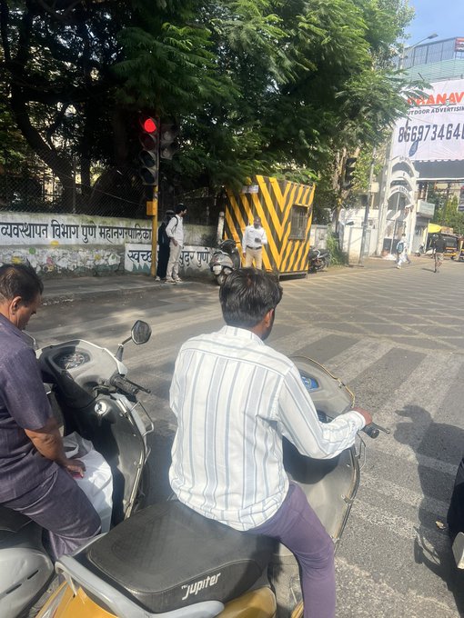 Two wheelers which hardly follow traffic signals at Ramtekdi Pune Solapur are stopped behind zebra crossing due to @PuneCityTraffic standing in front of them Many only follow rules if police is present @nachiket1982